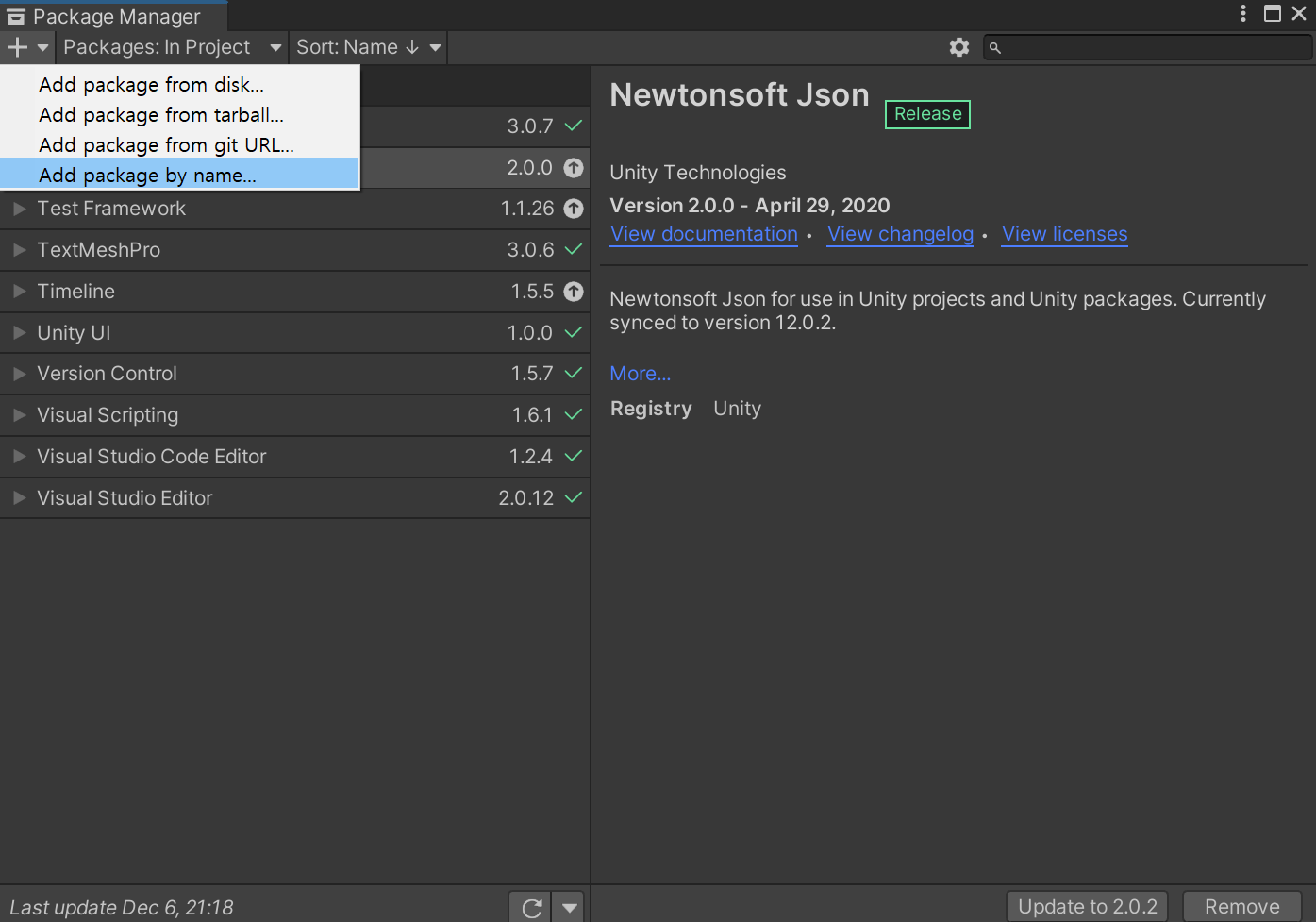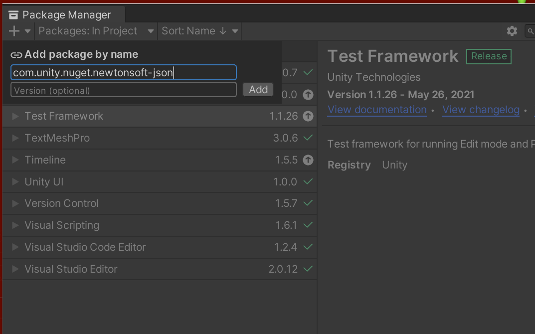 com.unity.nuget.newtonsoft-json 를 입력 후 Version 은 선택이지만 2.0.0를 입력 후 [Add]한다.